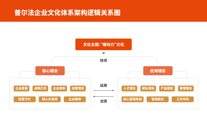 “暖動力”文化的文化主題,統領企業文化核心理念和企業文化應用理念。核心理念延展為應用理念,應用理念支撐核心理念。其中核心理念包括企業愿景、戰略口號、企業使命、經營理念、經營方針、核心價值觀、企業精神。