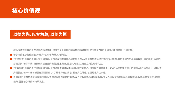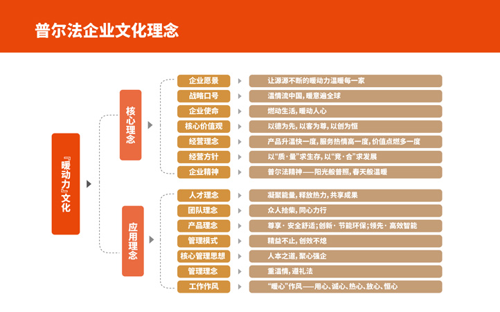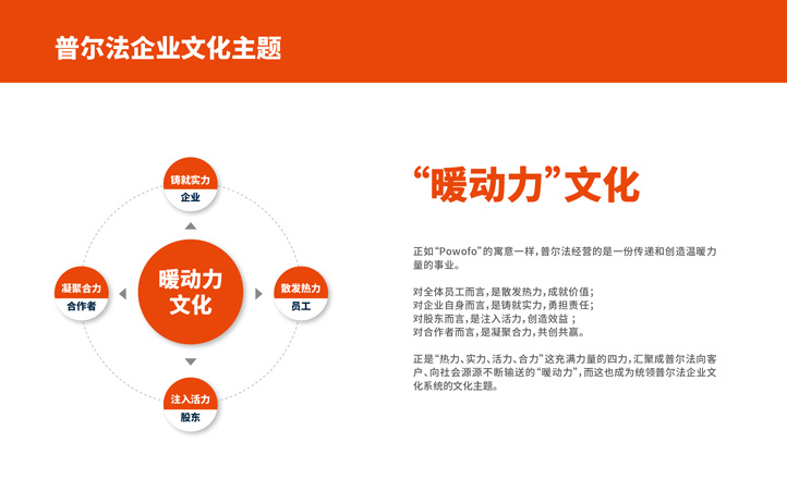 普爾法的企業文化主題是“‘暖動力’文化”,員工散發熱力,企業鑄就實力,股東注入活力,合作者凝聚合力。正如“Powofo”的寓意一樣,普爾法經營的是一份傳遞和創造溫暖力 量的事業。對全體員工而言,是散發熱力,成就價值;對企業自身而言,是鑄就實力,勇擔責任;對股東而言,是注入活力,創造效益;對合作者而言,是凝聚合力,共創共贏。正是“熱力、實力、活力、合力”這充滿力量的四力,匯聚成普爾法向客戶、向社會源源不斷輸送的“暖動力”,而這也成為統領普爾法企業文化系統的文化主題。