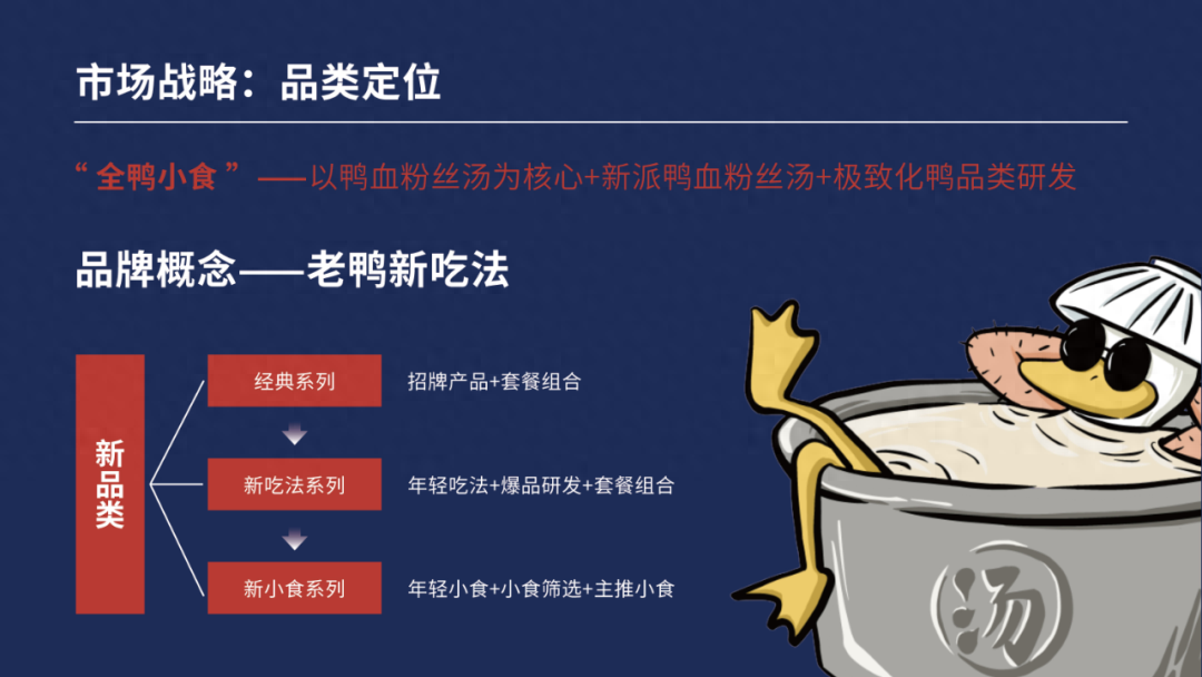 所以經過一系列的研究評估后,美御得出莫老鴨品牌的戰略定位——莫老鴨不應繼續在傳統快餐行業中內卷,而是重選賽道,改變品類,做更符合年輕消費群體喜愛的品類小吃,做「新派·鴨血粉絲湯」。