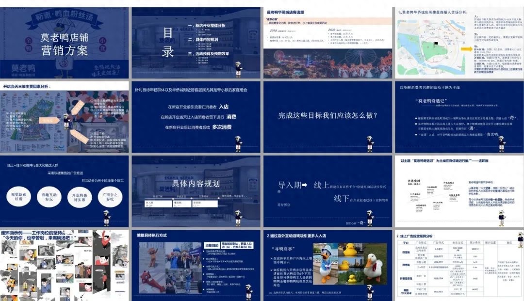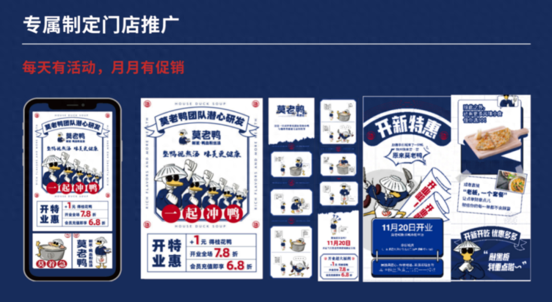 在莫老鴨的logo設計方面,美御采用了創始人莫振武為原型開發卡通形象,讓品牌更有記憶點,成為全新的超級符號,并且建立品牌色彩系統,打造獨有的品牌識別性,統一標準輸出對外傳播的視覺設計,讓莫老鴨IP成為占據消費者心智的獨特視覺概念。圍繞IP形象設計主視覺用于店頭展示,高頻率使用藍色輔以大面積留白,形成視覺聚焦點的同時,也能表達出品牌的活力個性,讓「莫老鴨」在各種裝修風格的商場店鋪中變身吸睛、獨特的存在,成為一眾目標消費者的選擇。