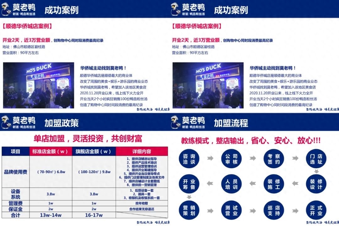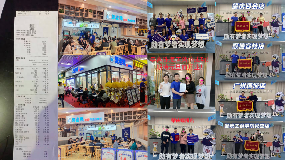美御還依據多年來餐飲行業的觀察和案例反饋,為莫老鴨定制招商政策,協助莫老鴨全國招商,并提供相應的運營支持服務,幫助品牌完成可持續的長期商業增值。在莫老鴨品牌升級后的1年內新增100家加盟店,年銷售額三倍增長,21年全年銷售額突破2億+。