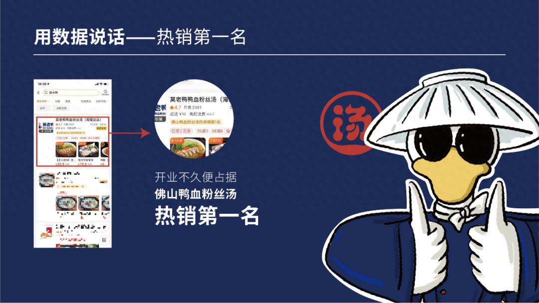 美御在調研時發現兩個關鍵點。第一,“鴨血粉絲湯”常年霸占美食榜頭名,且店鋪布滿大街小巷。美團外賣統計數據顯示,在南京地區,2018年鴨血粉絲湯單量比2017年增長了3倍,全年賣出了200多萬單,全國的鴨血粉絲湯店鋪遍布大街小巷。這就導致雖然鴨血粉絲湯好賣,但莫老鴨混在全國各個鴨血粉絲湯品牌里,品牌形象整體視覺表達雜糅,尚未形成系統的視覺語言,不足以在行業形成獨特身份,更難以在消費者心中建立起品牌認知。第二,當今的消費者越來越關注食品健康,鴨血粉絲湯的質量不足以讓消費者放心品嘗,這就說明莫老鴨必須在鴨血粉絲湯的品質上必須做到行業上乘,做出讓消費者看得見、放心吃的優質鴨血粉絲湯。