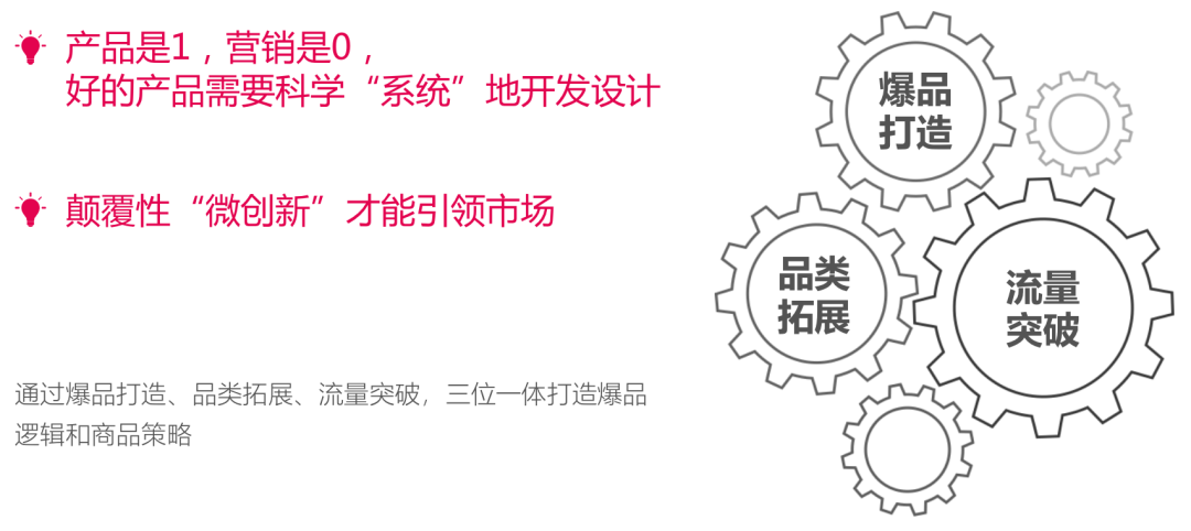 產(chǎn)品塑造的核心,是對(duì)用戶的洞察創(chuàng)造,從單純的占領(lǐng)“產(chǎn)品品類”轉(zhuǎn)向經(jīng)營(yíng)“年輕人和產(chǎn)品”,最終營(yíng)銷一種“品牌綜合體驗(yàn)”或“生活方式”。可以通過(guò)爆品打造、品類拓展、流量突破,三位一體打造爆品邏輯和商品策略。
